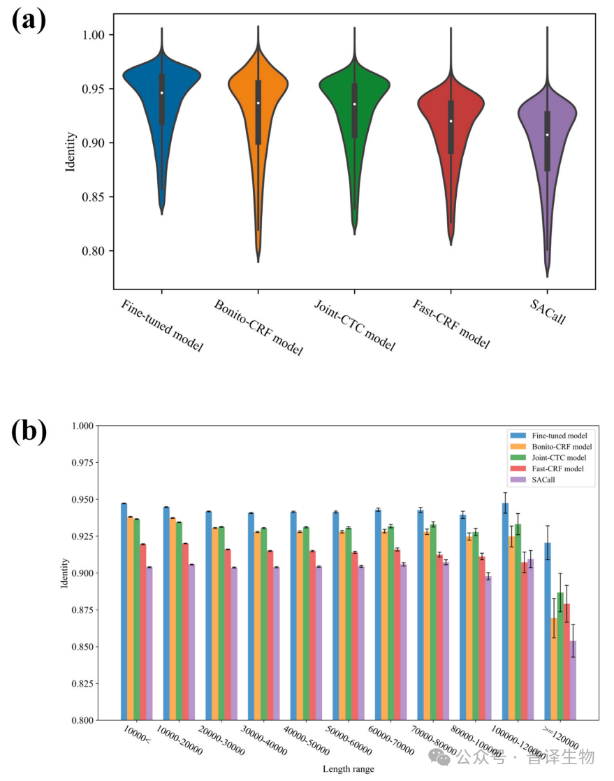 研究团队在相同基准数据集上进行了严格的性能评估,BaseNet所包含的Fine-tuned model优于最新Bonito CRF模型,Joint-CTC model 和Fast-CRF model 性能优于SACall(图4a)。此外,在长读长情况下,BaseNet所开发模型表现出更优异性能(图4b)。上述测试结果表明与现有其他解码算法相比,BaseNet表现出更好的解码性能。