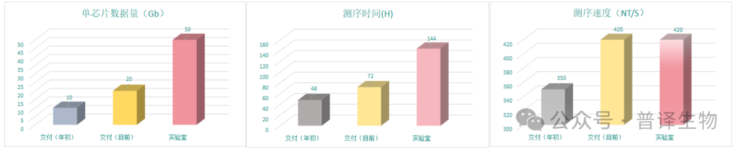 凭借强大的研发团队和深厚的的技术积淀 ,普译生物的纳米孔测序产品技术快速迭代,各项测序指标大幅提升。例如,Polyseq纳米孔体系测序速度从350 nt/s提升至420 nt/s,连续测序时长从48 hrs提升到72 hrs, 单芯片测序通量从10 Gb提升到稳定交付20 Gb。然而,普译人的技术追求没有极致。在实验室, Polyseq纳米孔体系的单芯片数据通量已达50 Gb,测序时长已达超144 hrs。创始人团队多年的研发积累有力地支撑了测序技术的快速迭代发展和产品性能的持续跃升,这也是普译生物最大优势所在。