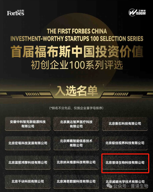 2025年4月7日,福布斯中国与卫斯登联合发起的“首届福布斯中国投资价值初创企业100系列评选”结果正式揭晓,普译生物凭借其在测序技术领域的创新成果和巨大发展潜力,荣耀入选榜单。