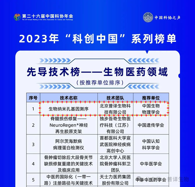 在7月2日召开的第二十六届中国科协年会上,中国科协正式发布2023年“科创中国”系列榜单。榜单发布先导技术榜150项、新锐企业榜50项、融通创新组织榜10项、技术经理人先锋榜20项,共计230项入榜项目。普译生物以“生物纳米孔基因测序”技术,在先导技术榜——生物医药领域榜单上赫然榜首!