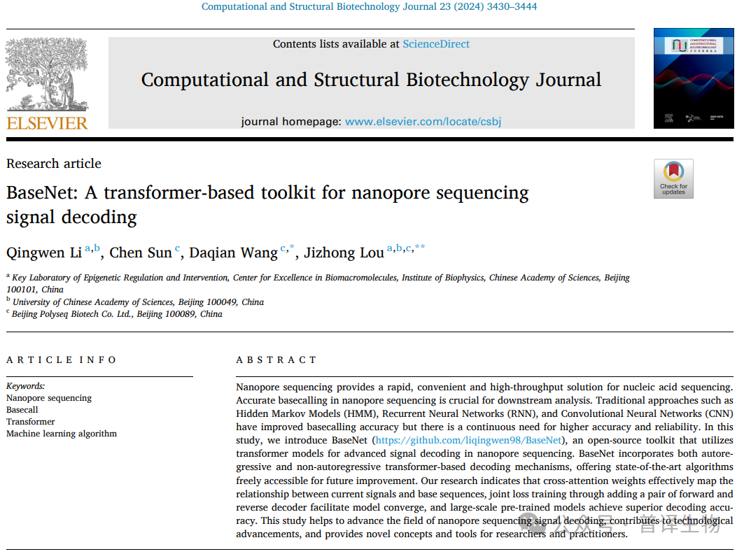 2024年9月25日,普译生物与中国科学院生物物理研究所合作在《Computational and Structural Biotechnology Journal》杂志在线发表了题为“BaseNet: A Transformer-Based Toolkit for Nanopore Sequencing Signal Decoding”的研究论文。该研究提出了一款基于多种最新Transformer算法的纳米孔测序信号解码工具包BaseNet(图1),包括: